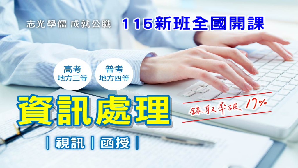 資訊處理為高普考缺額最多的類科之一,每年穩定開缺,考試科目與地方特考、初等考、調查局特考考科相近,適合一次準備、多次報考。高普考每年3月報名、7月筆試,地方特考則於9月報名、12月考試。穩定缺額、薪資與福利,成為資訊背景考生上榜熱門選擇。桃園.中壢.藝文特區等桃園地區考生最信賴的公職補習品牌,一致推薦:桃園志光數位學院!