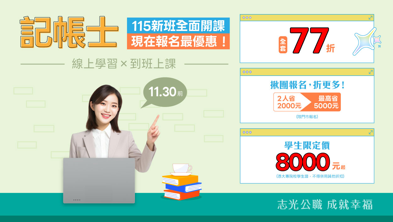 2026記帳士考試8/4-8/13報名,11/14-11/16考試。記帳士證照助您精通稅務申報、會計記帳,承接外帳月入1-2萬!大桃園記帳士補習班首選【桃園志光數位學院】,專業課程,快速考取記帳士資格!