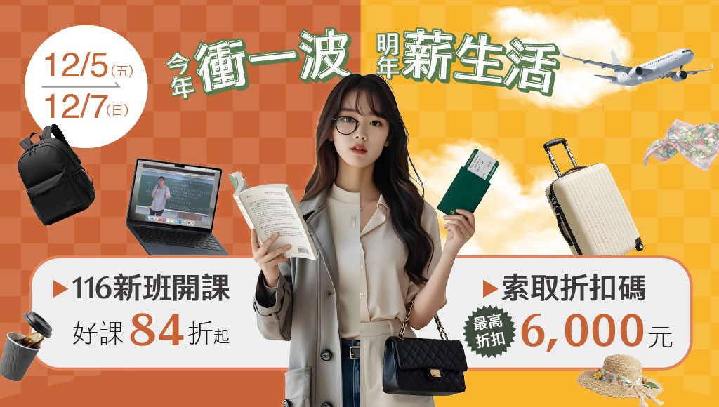 12/10前憑【114司法/調查局/海巡特考-二試成績單】報名正規全套課程,再折3,000元。 12/9~31憑【114中油、台菸酒-准考證&114台船筆試放榜成績單】報名正規全套課程,再折3,000元。 |