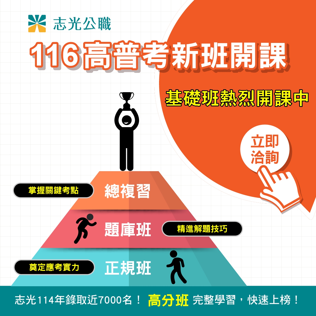 公務人員高普考年滿18歲以上即可報考,高考三級需大學以上學歷 ;普通考試需高中(職)以上學歷,技術類科須符合規定之相關系所畢業,及證照類需具有相關證照、訓練或工作經歷證明文件。