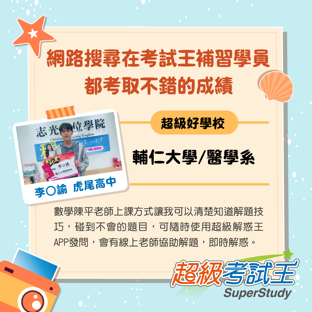 超級考試王全國最大連鎖升學補習班,首創「到點」加「雲端」雙效學習,針對升大、學測、分科測驗、高中英數物化等提供高效名師課程,歡迎來班免費試讀。