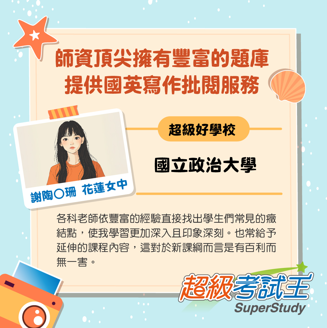 學習提問可使用「超級解惑王」專用APP拍照上傳,全天候24小時都可以發問問題,讓學生更便利排除課業疑問。 | 國文、英文課程含括寫作練習,由授課老師親自批閱,循序漸進提升寫作力。 | |||