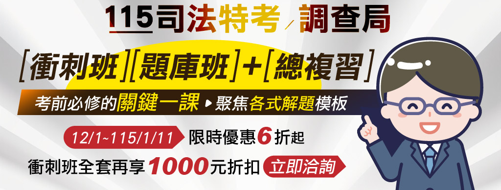 | 7.【115司法特考四等】報名年度班、高分年度班正規全套課程,再折6,000元(四等書記官除外) | ||