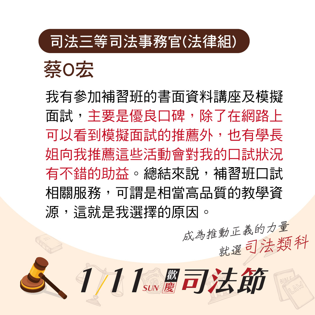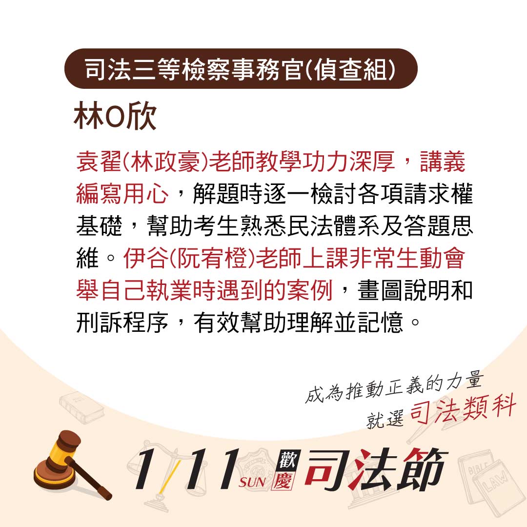 | 3.【司法特考三試放榜】114/12/31~115/1/10憑【114司法/調查局/海巡特考-三試成績單】報名正規全套課程,再折3,000元。 | ||