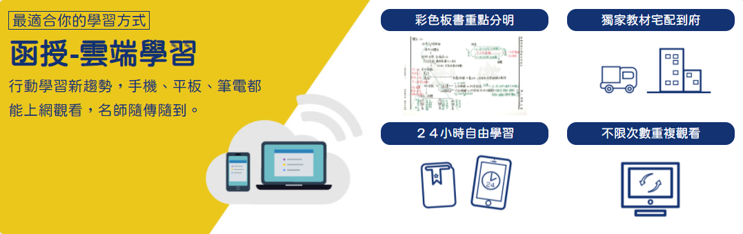 雲端學習,手機、平板、筆電都能上網觀看,不受時間空間限制。
