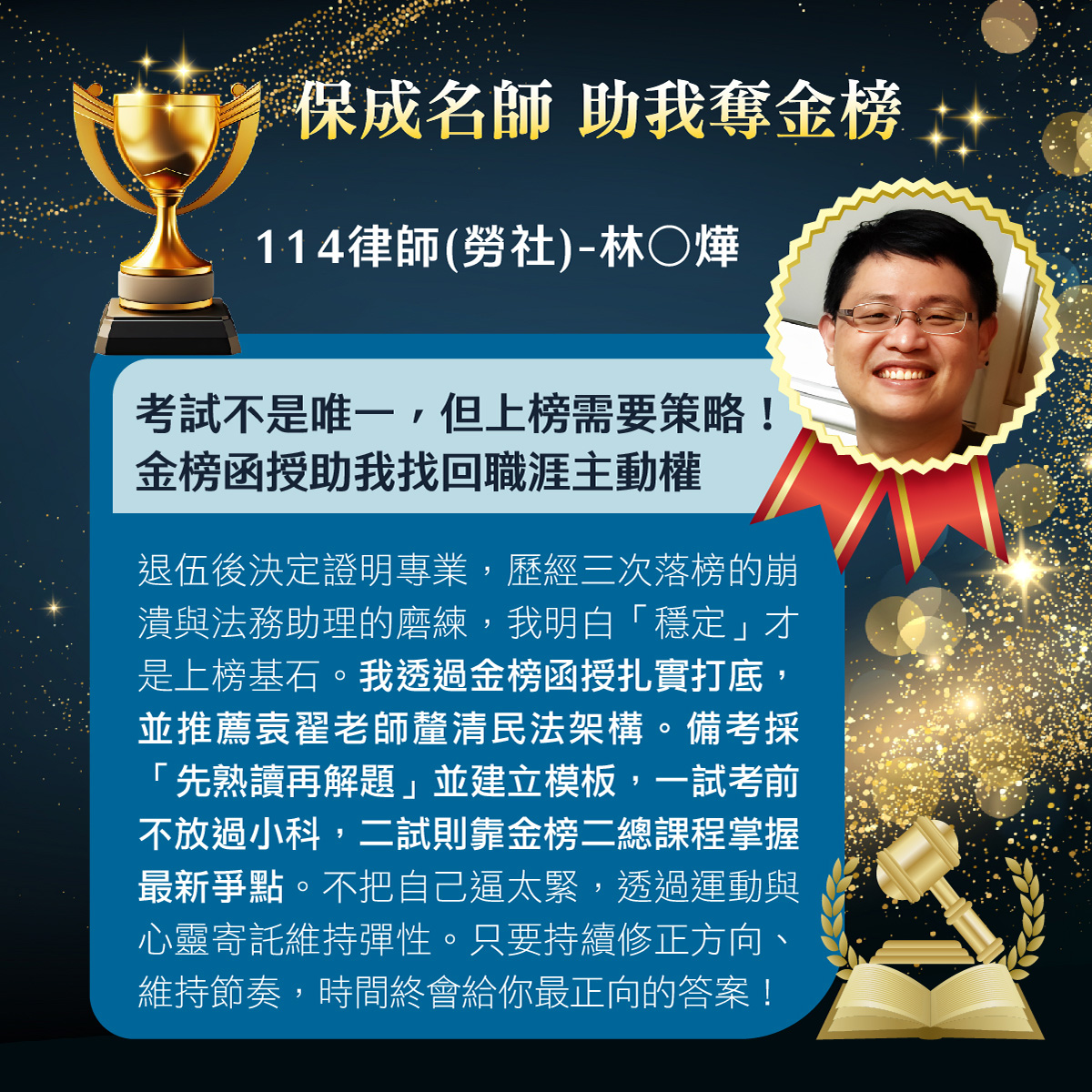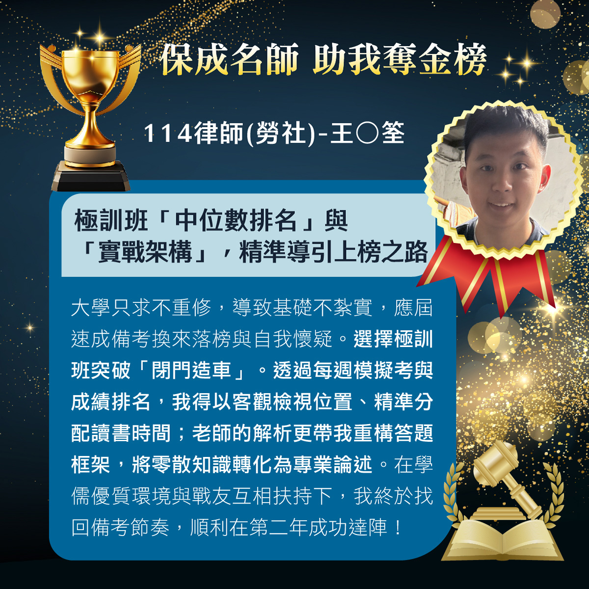 | 律師司法官考試的難度較高,「115必勝金榜班」可以在第一年先衝刺律師,第二年接著衝刺司法官,這樣才會分散考試的壓力。 |