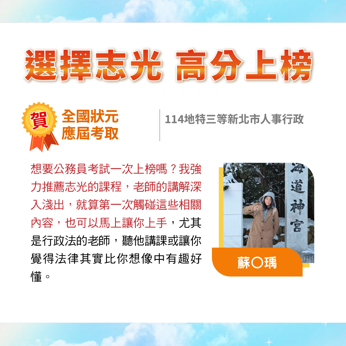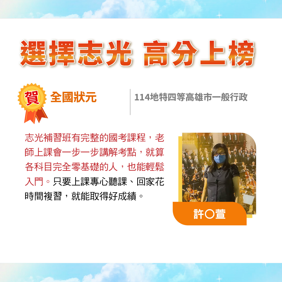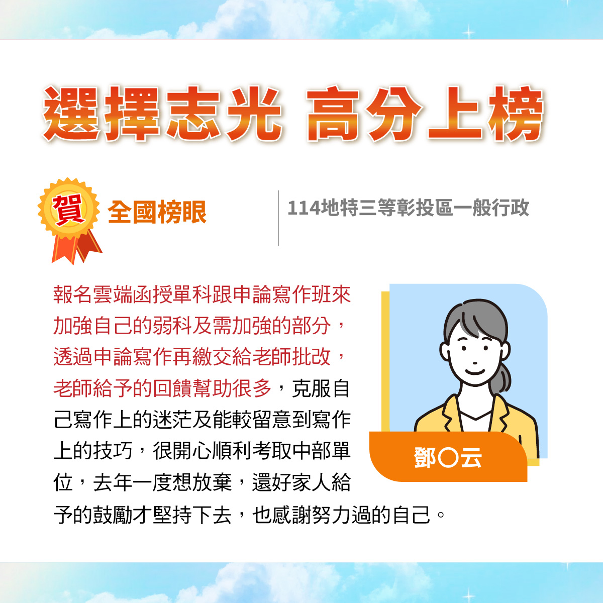 感謝補習班提供的資源與規劃,使我在短短四個月的衝刺中能夠方向明確,少走許多冤枉路。老師們的課程內容專業且實用,且在課堂上也給予許多鼓勵,只要跟隨他們的指引,就能一步步累積成果。