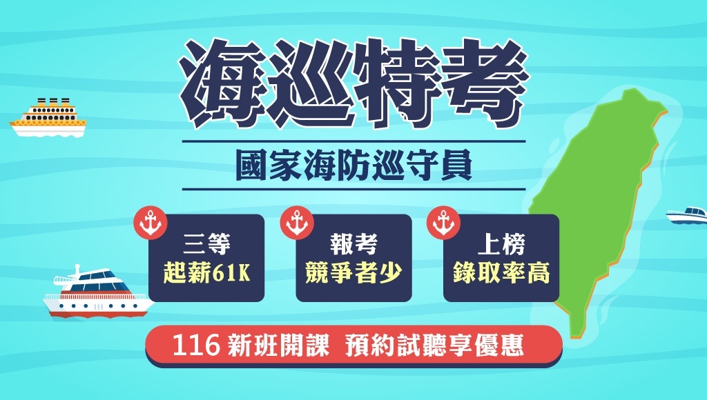 【海巡特考】116新班開課中,立即報名,快速上岸!