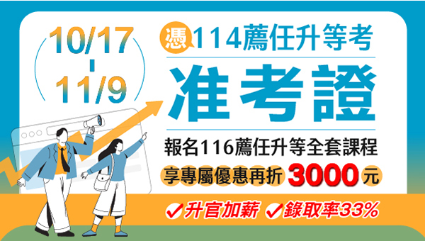 | 11/1-11/09憑【114薦任升等考准考證】報名正規全套課程,再折3,000元 | |