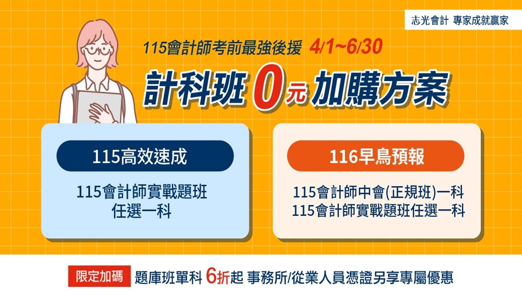 會計師於115.8.15~8.17招考,該執照採滾動式科別及格制,考取機會提升。取得會計師證照,大學畢業薪水約3.7萬、研究所約4.2萬,一般會計事務所另有績效及年終獎金。快洽溪湖志光數位學院!