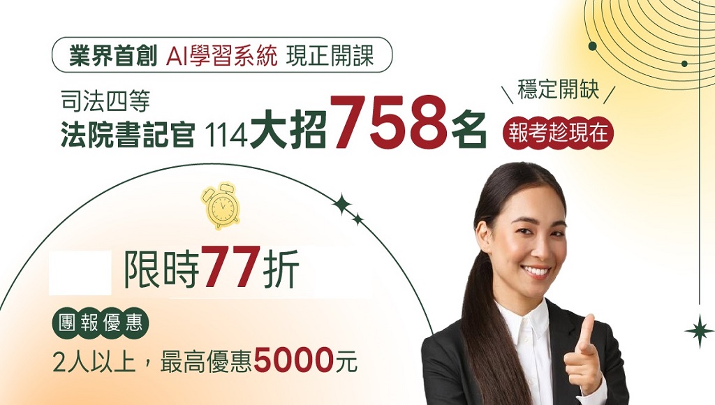 【司法特考】115司法書記官77折 現正優惠中