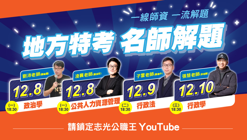 地方特考115年9/8~9/17開放報名,並於115年12.05 - 12.07正式應試!考科調整比照高普考,提升錄取公平性;採分區報名、錄取及分發,工作地點可選、在地就業首選!熱門類科報名熱潮升溫中,立即洽詢草屯志光,掌握課程規劃與應考優勢!