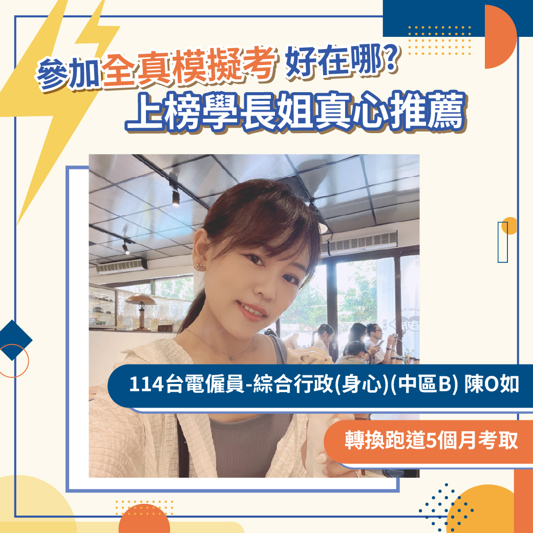 在備考過程中,我善用全真模擬考,讓我能夠檢視自己的學習成果,也幫助我快速修正,讓我適應正式考試的時間壓力。 我有參加全真模擬考,幫助非常大。模考能讓自己更快適應考場節奏,也能提早培養對於考試的真實感與時間感,這在考試中很重要,畢竟考試分秒必爭,對題型要有一定熟悉度