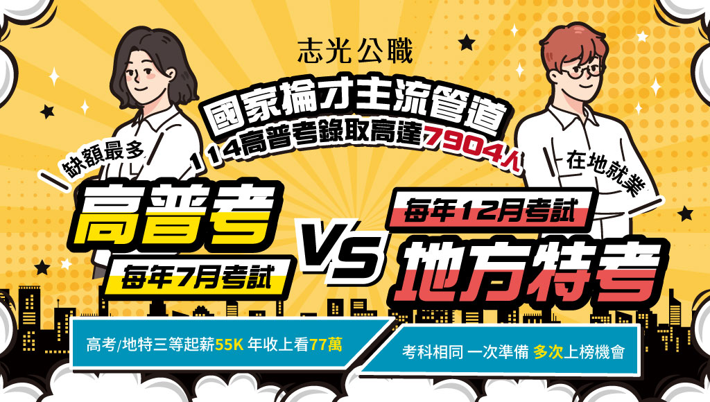 115年高普考火熱招生中!招考類科包含一般行政、財稅行政、會計、人事等熱門職系,穩定薪資、福利優渥、升遷制度完善。南投志光數位學院應屆&畢業生專案限時啟動,立即加入快速上榜行列!