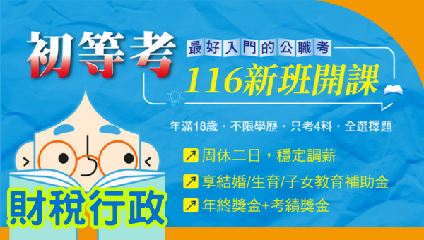 初等考財稅行政科目僅考4科, 全部皆為選擇題,只要年滿18歲,即可報考,沒有學歷科系限制,是公職考試的入門首選。最新考情速洽:虎尾志光05-6337155