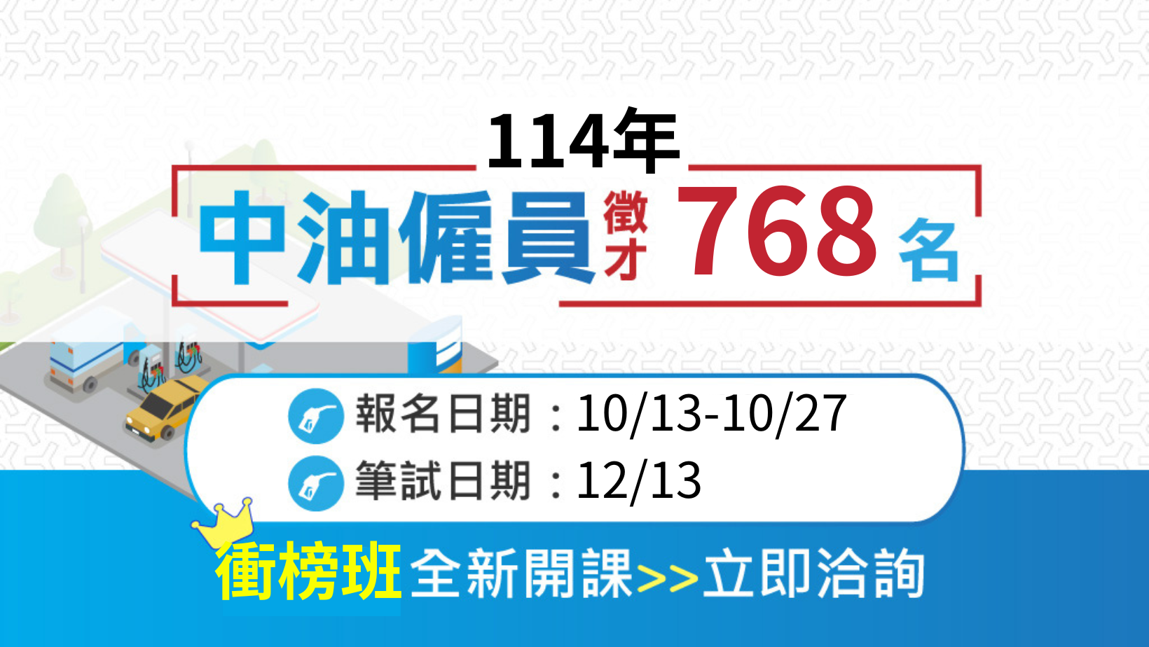 台灣中油公司今日公告(10/3)114年招募新進僱用人員768名,招考對象為高中(職)以上畢業人員,招考類別包括煉製、機械、儀電、電氣、電機、土木、安環、公用事業輸氣、油料操作、天然氣操作、油罐汽車駕駛員、探採鑽井1、探採鑽井2、事務1、事務2、消防、加油站儲備幹部、護理、航空加油、航海等20類。