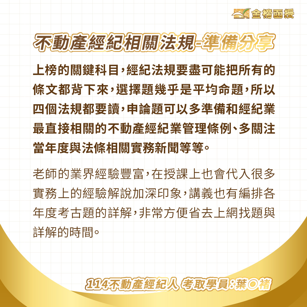 廖○惠地政士/不動產經紀人/普考地政 課程中老師每章節均附有歷屆考題與延伸議題供深入學習及練習,老師亦會教導解題技巧,任何問題均可詢問老師。補習班是準備國考的後盾,目標既定堅持走下去,上榜是你該得的結果。