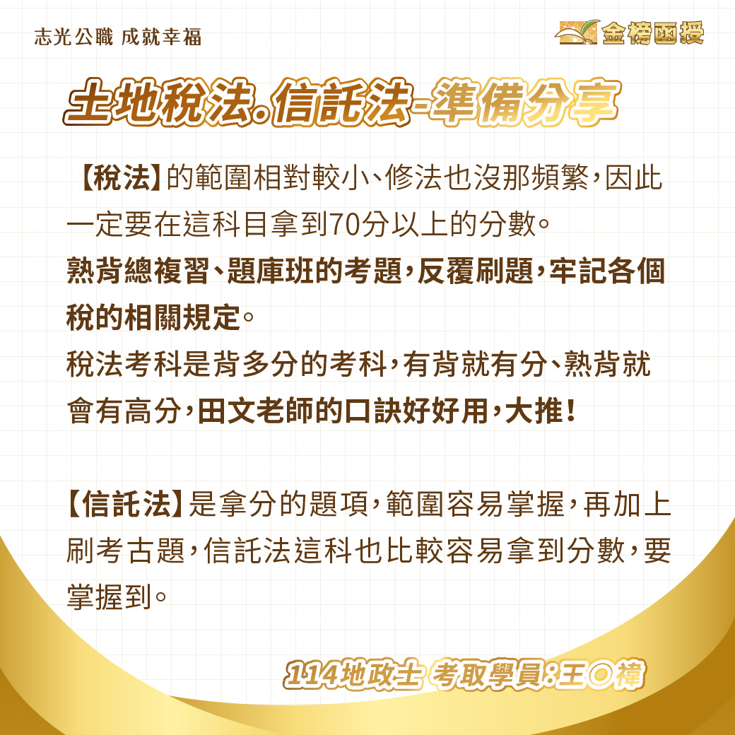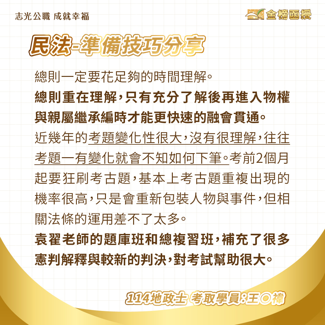 黃○祺高考地政由於非本科系,依補習班安排讀書進度,在家上課是很方便的學習工具,聽不懂就重覆不斷聽!另外也將講義及法條複習至考前一天,同也謝謝老師用心和生動活潑教學,讓在職工作的我,投入地政的專業領域。