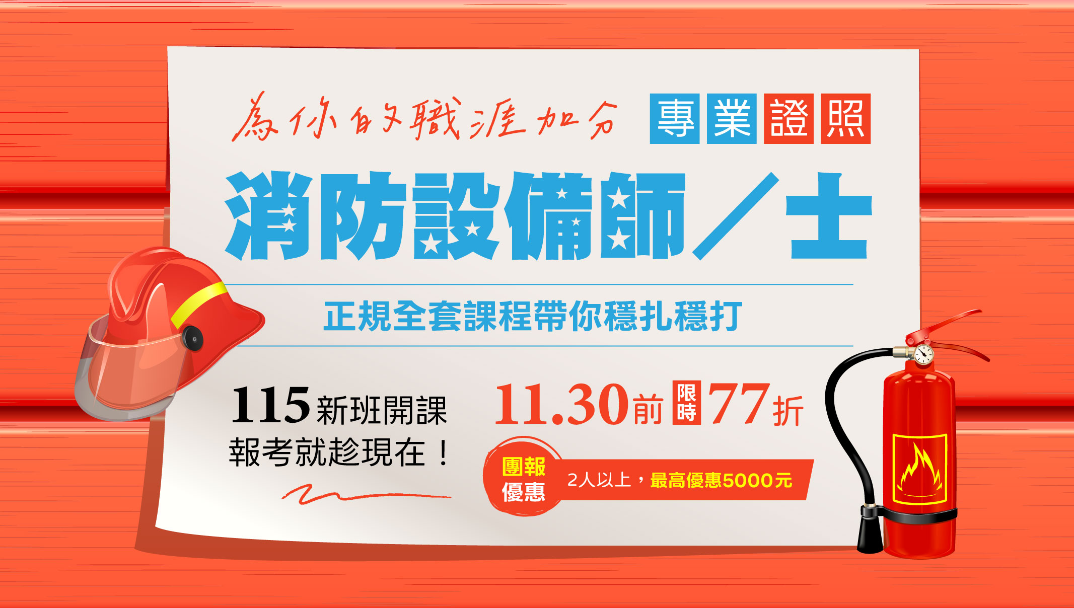 專技高普考消防設備士懶人包!2月報名、6月開考,高中職以上即可報考。通過國考可從事消防設備設計、安裝與檢修等專業工作。掌握報名流程、考科重點與資格條件,輕鬆拿下消防設備士證照,開啟消防專業職涯!