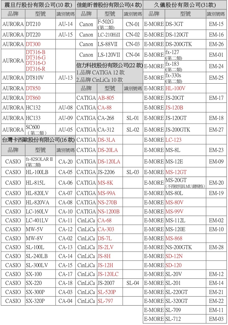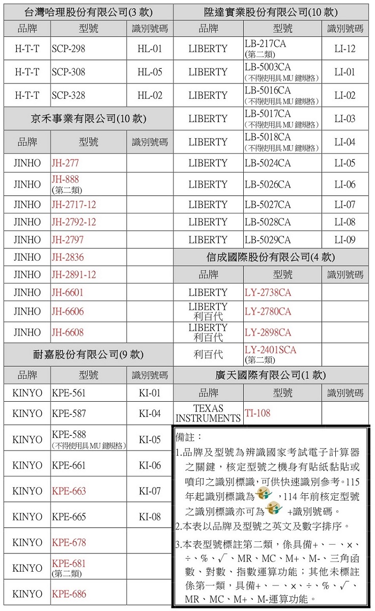 考選部核定之 120 款國家考試電子計算器(自 115 年 1 月 1 日適用) |