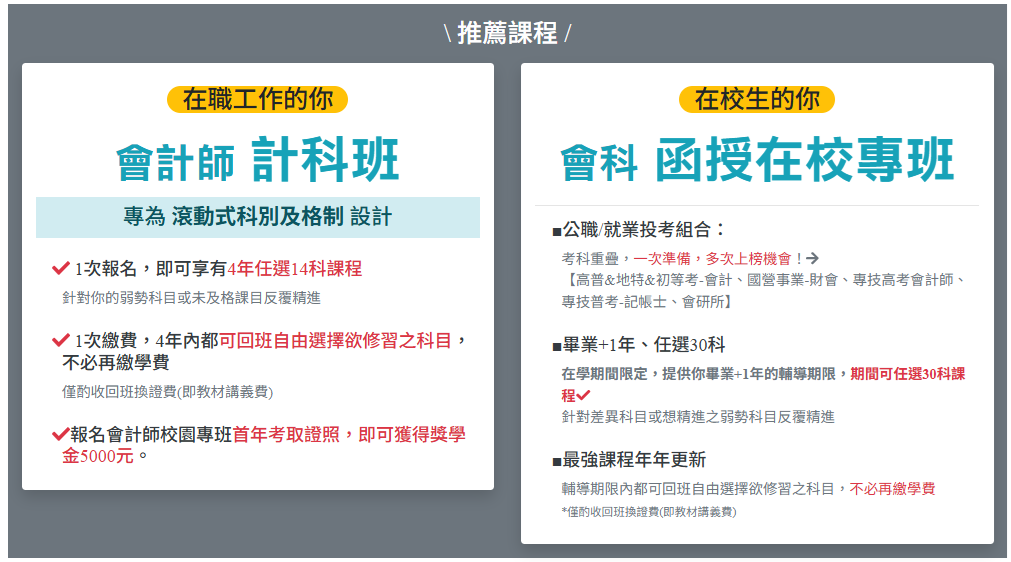 大二→大三→輔考至大四畢業考試一次收費,兼顧課業並取得就職搶手專業證照。