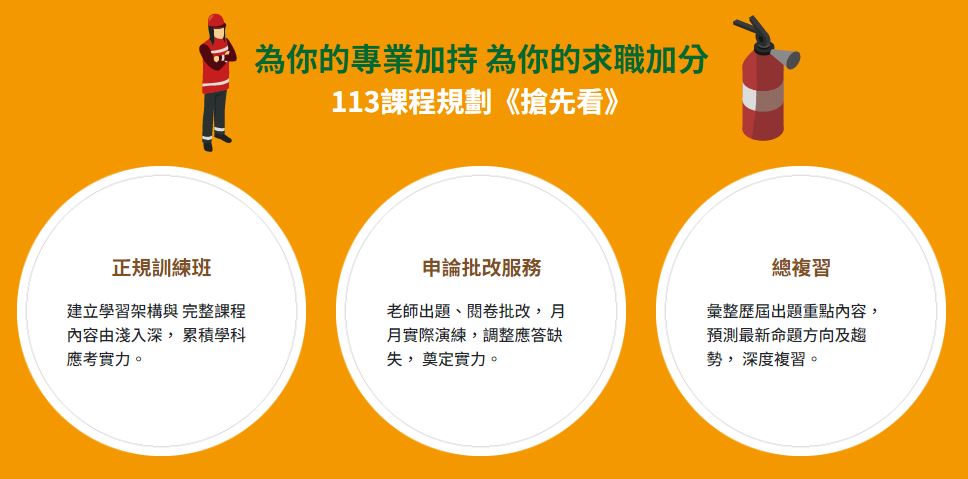| 應試科目 | 1.消防法規概要 2.火災學概要 3.水與化學系統消防安全設備概要 4.警報與避難系統消防安全設備概要 |