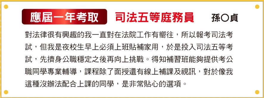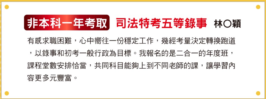 高普考|初等考|佐級|地方特考|警察考試(一般)(內軌)|司法考試|國營事業|教師甄試(檢定)|教師資格考|外交特考|身心特考|民航特考|教保員|泛國營事業|地政士|專技高考|專技普考|會計師|記帳士|郵局|鐵路特考|台電|台菸|中油|中鋼|台糖|台灣自來水|社工師|金融基測|消防設備士|不動產經紀人|超級函授|金榜函授|高效函授|超級考試王