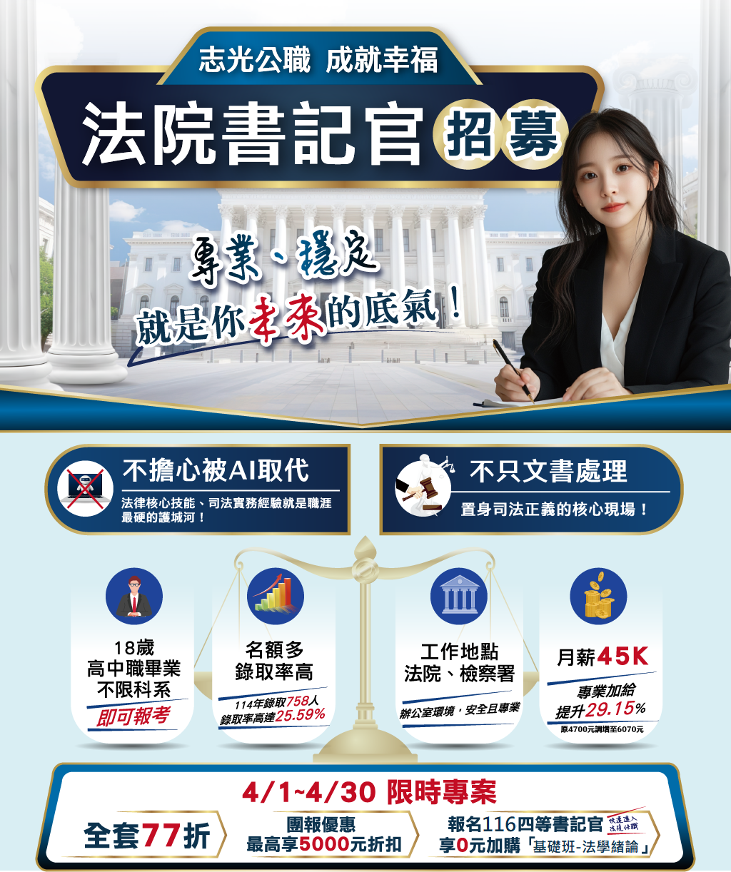 新營志光熱招116司法特考新班!三、四、五等不限科系即可報考,書記官、監所管理員、法警職缺熱門,薪水優於同級公務人員。立即預約免費諮詢,掌握報考時機與優惠!新營、柳營、鹽水、後壁、東山、白河等地區補公職、國營、教師考試最佳首選,專業輔考就找新營志光06-6352141。