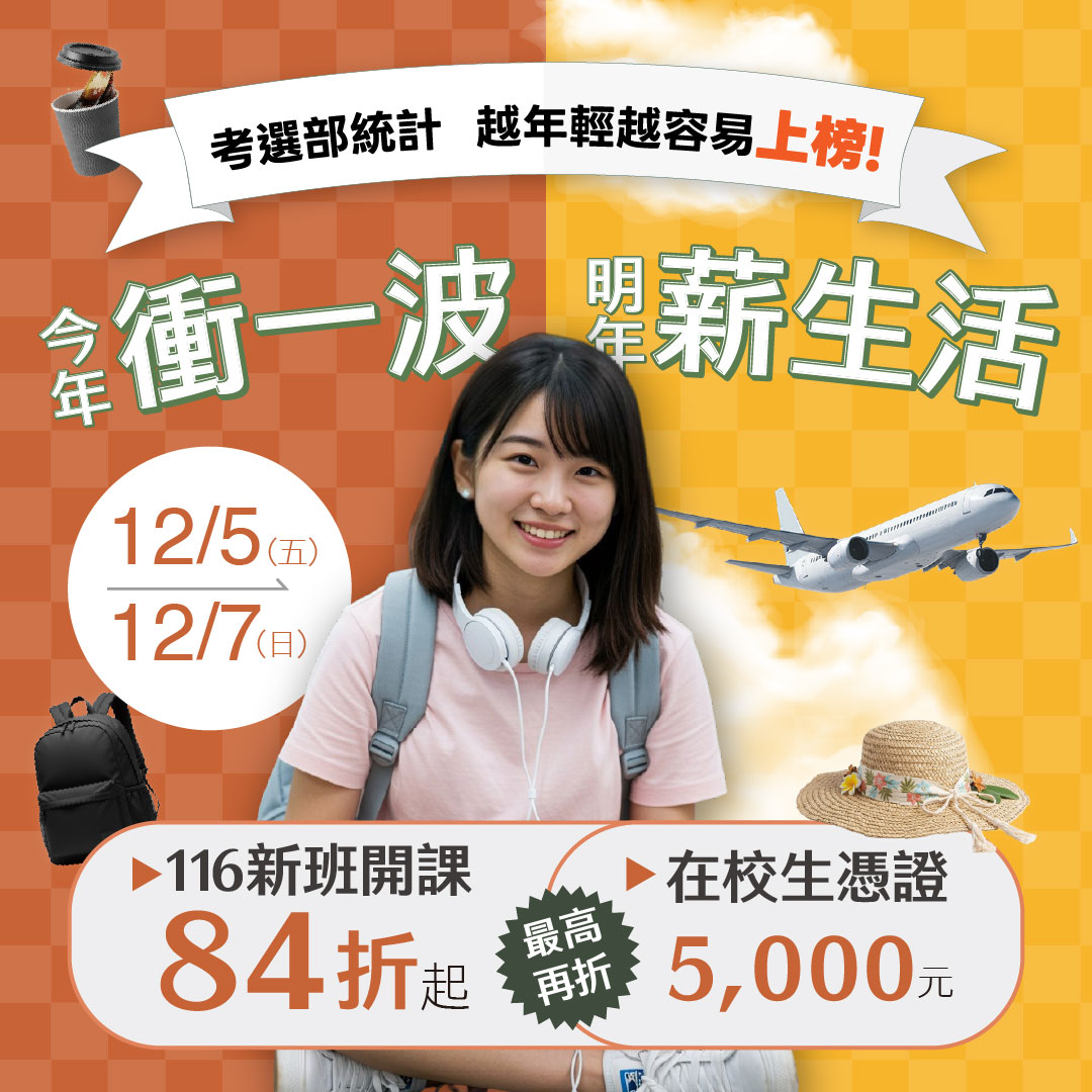 | 會計師/律師/地政士/記帳士各領域一線名師課程 | 會考、學測、分科測驗第一志願名師新班開課 |