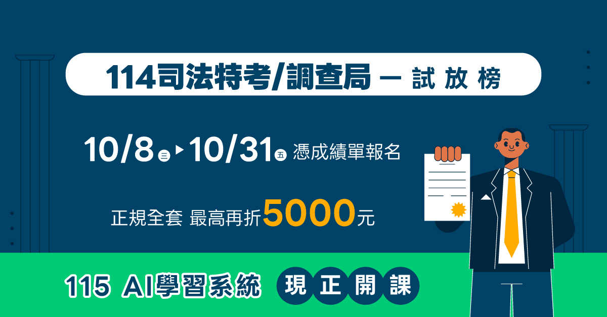 【司法特考】錄取率再創新高 10/31前憑成績單84折起最高再折5000