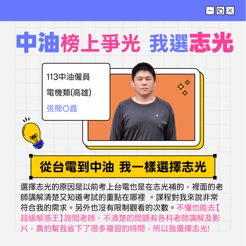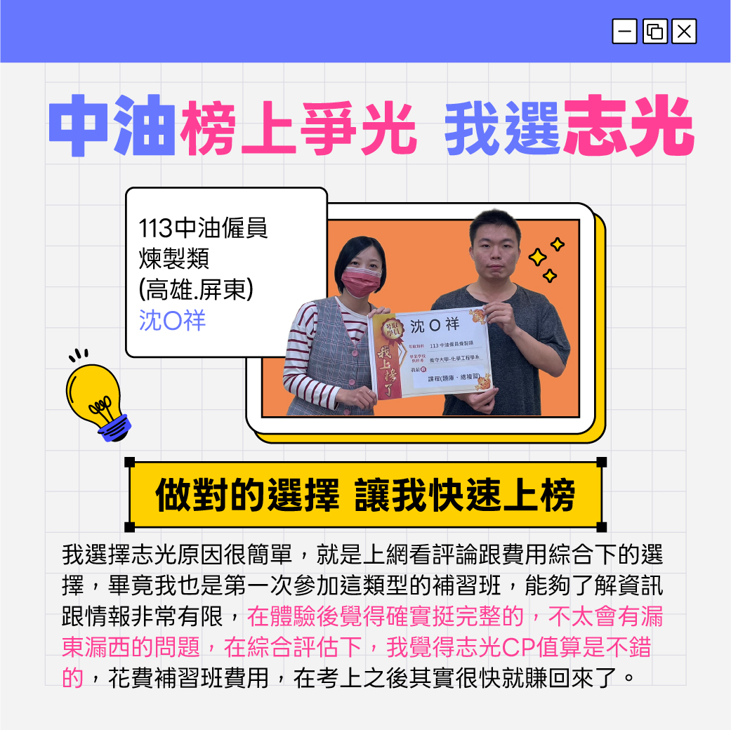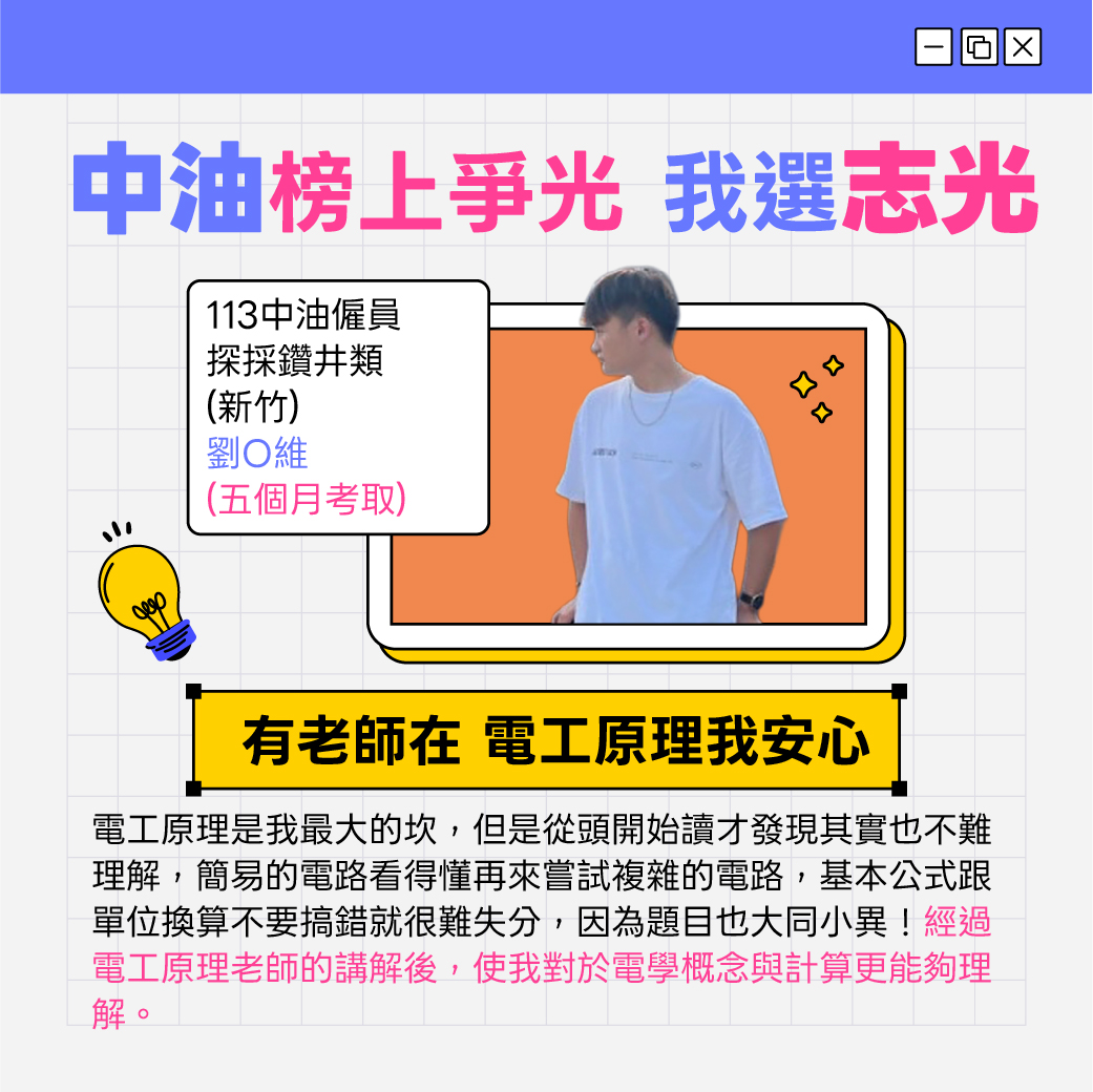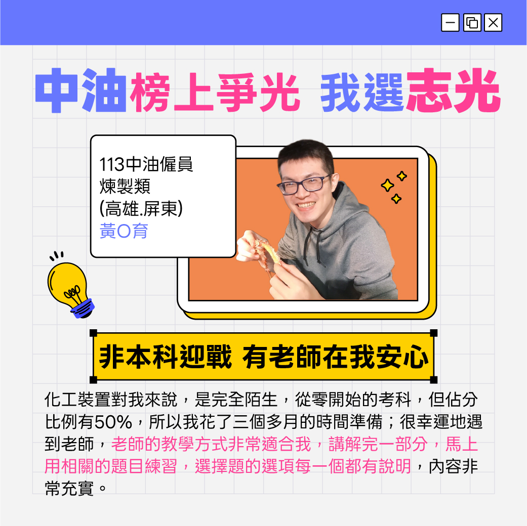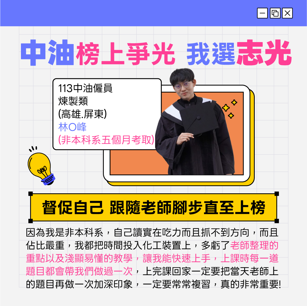 115中油僱員新班開課,招考類別包括煉製、機械、儀電、電氣、電機、土木、安環等。中油公司為國營事業之一,工作穩定且訓練完整,享有中油公司之福利,高中職以上畢業即可報考,符合應考資格者,應把握機會,提早準備以利報考。預約試聽06-7236776佳里志光