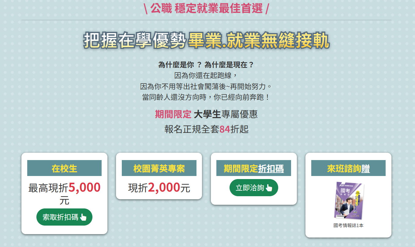 【12月學生專屬優惠】公職、國營、證照課程,最高折扣萬元