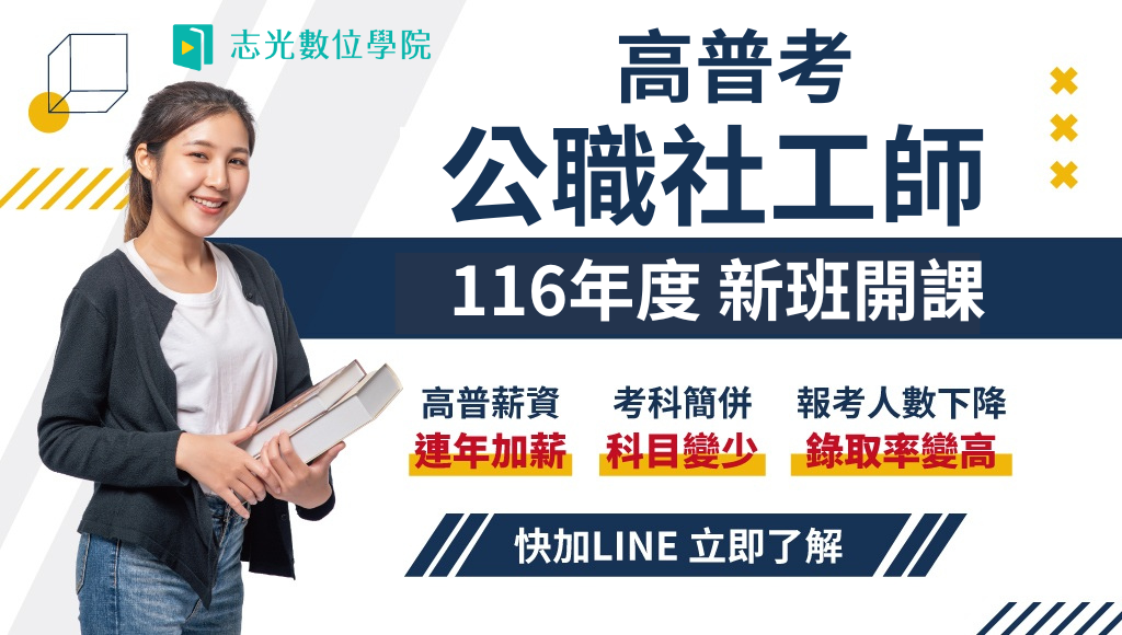 115年衝刺班、116年正規班【公職社工師】考試科目、時間。公職社工師無論於考試科目或工作內容,都較具專業門檻競爭者相對少。且相對於一般社工有較佳的工作待遇和穩定性,是社工師就業的理想選擇。【雙效學習】視訊:到點專注學習 +函授:雲端隨時複習 ,補公職、國營、教師考試最佳首選,專業輔考就找佳里志光數位學院06-7236776