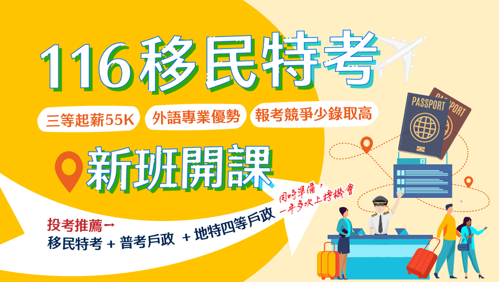 【移民特考】報考競爭少錄取高 116新班優惠86折起