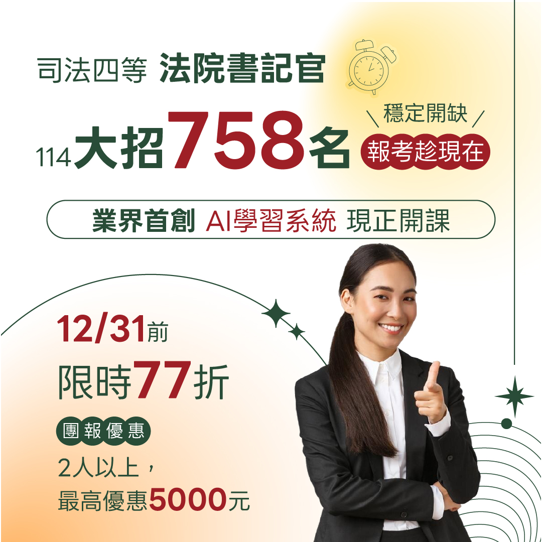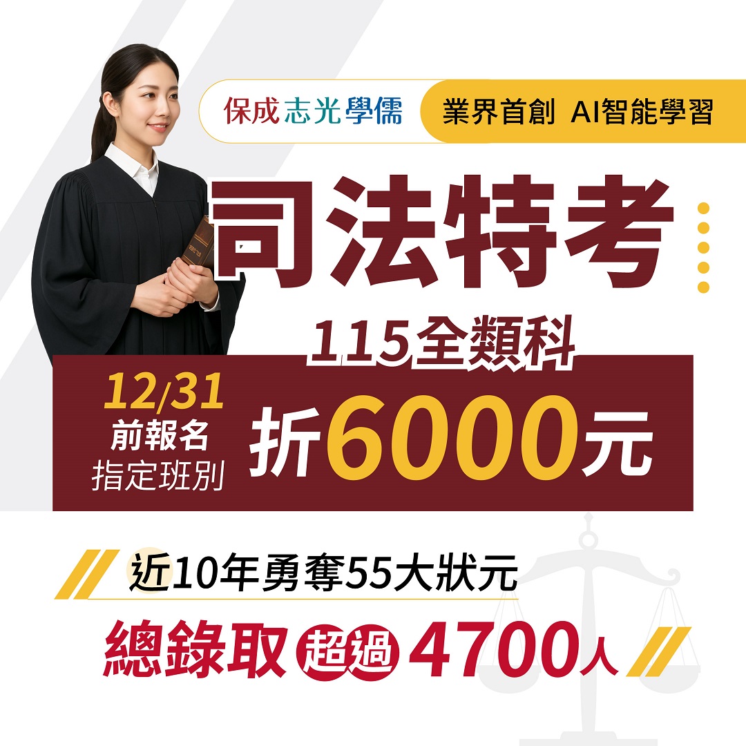 【司法特考】115衝榜折6千 116新班優惠86折起