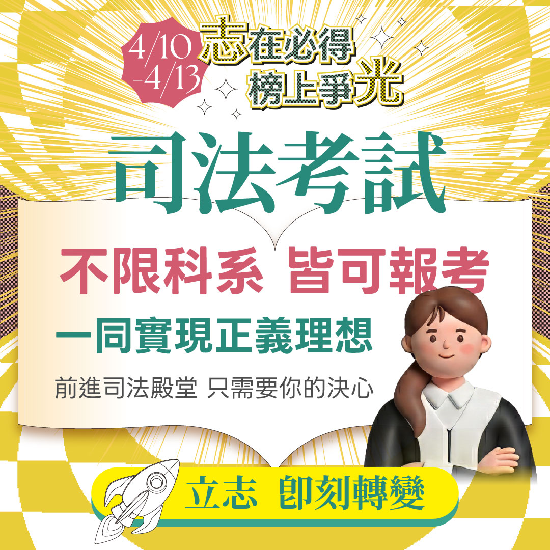 【司律在校生團報】 憑在校生證明 全套課程 最低66折 限定課程最高再折5000元 【一二試總複習.爭點解題班】 超低優惠價 |