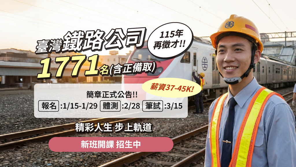 鐵路局人力大退休潮,台鐵公司化招考新進人員,轉職及就職機會大增, 本篇介紹台鐵公司從業人員考試資格、薪資、工作內容、考試科目、時間、缺額等,筆試只考一科選擇題,考科少易準備!相關考情詳電 06-6027289 志光數位學院-成功分校。