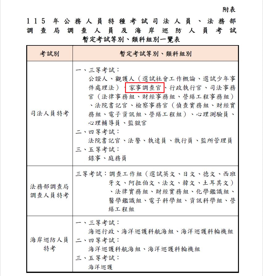 司法院為因應少年及家事法院業務用人需要,為新增三等考試家事調查官類科,非相關科系也可報考。