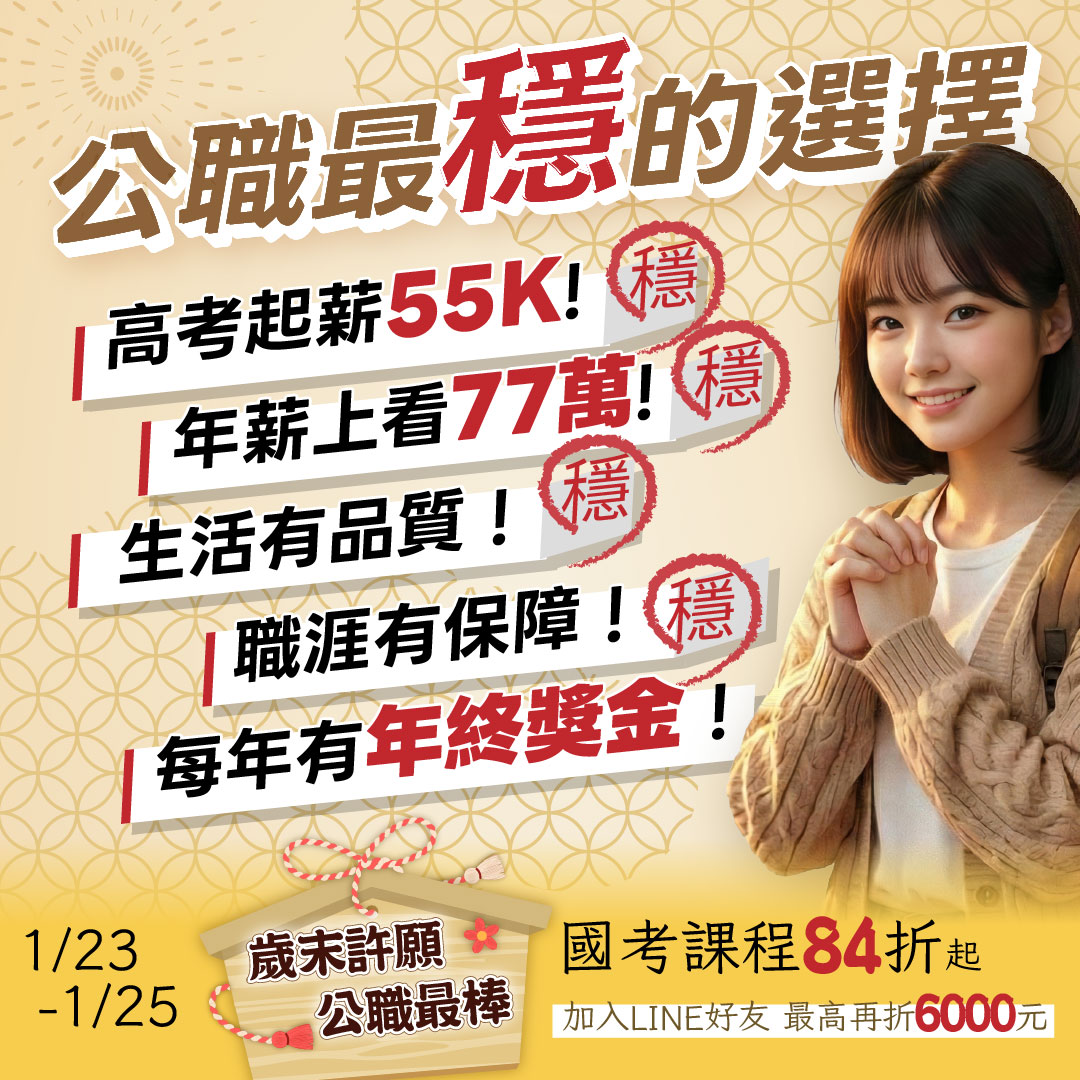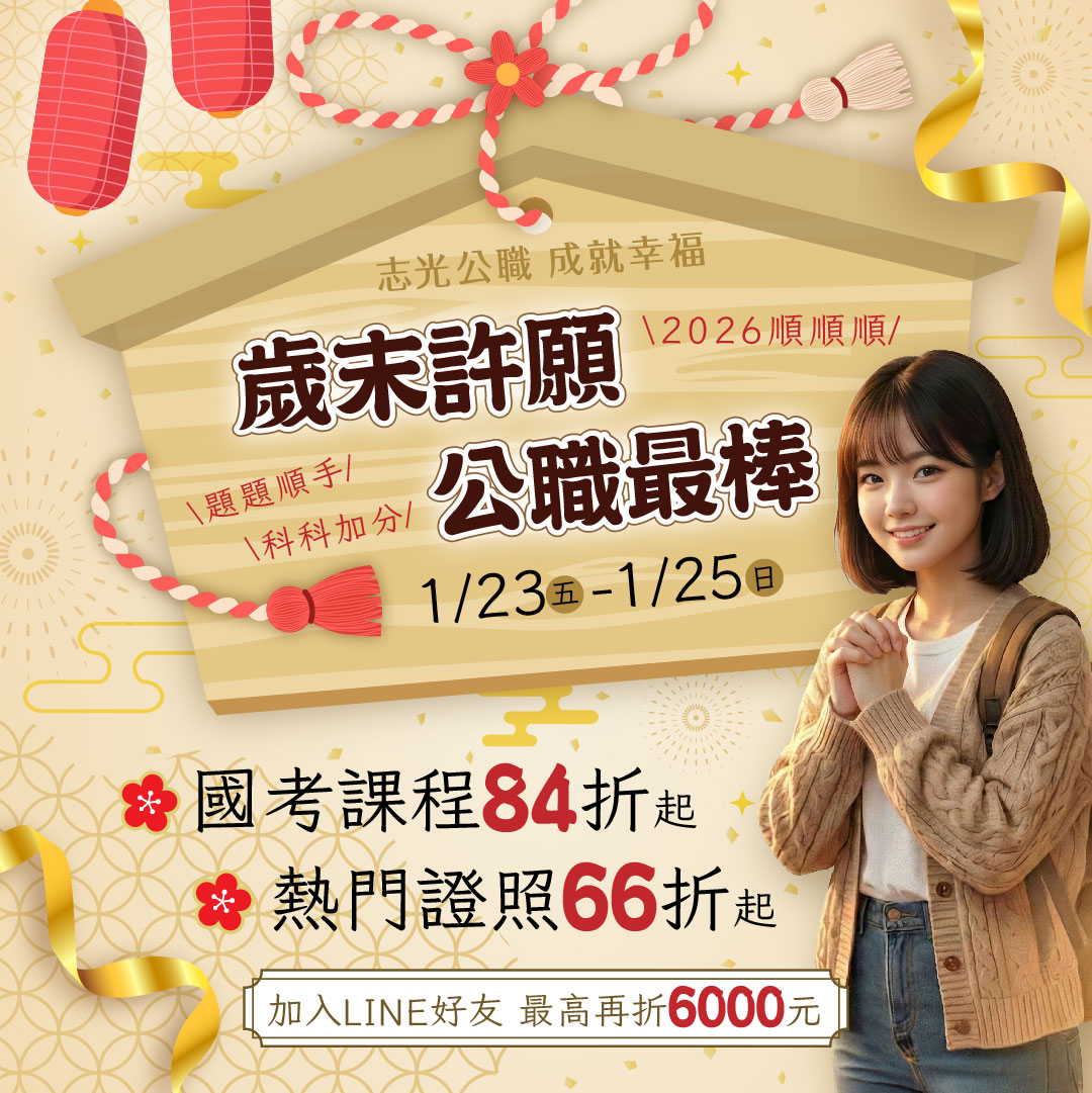 動盪年代,選擇穩定未來。公職與國營具備穩定薪水、完整福利與長遠發展,是打造安穩人生的最佳選擇。成功志光數位學院 2026–2027 早鳥優惠開跑,函授 84 折起,再享加碼優惠與學習好禮!高普考、地方特考、司法、警察、國營就業、警專升學、教甄與證照課程全面開課,名師雲端教學,在校生、畢業生與轉職族皆適合,助你一次上榜。