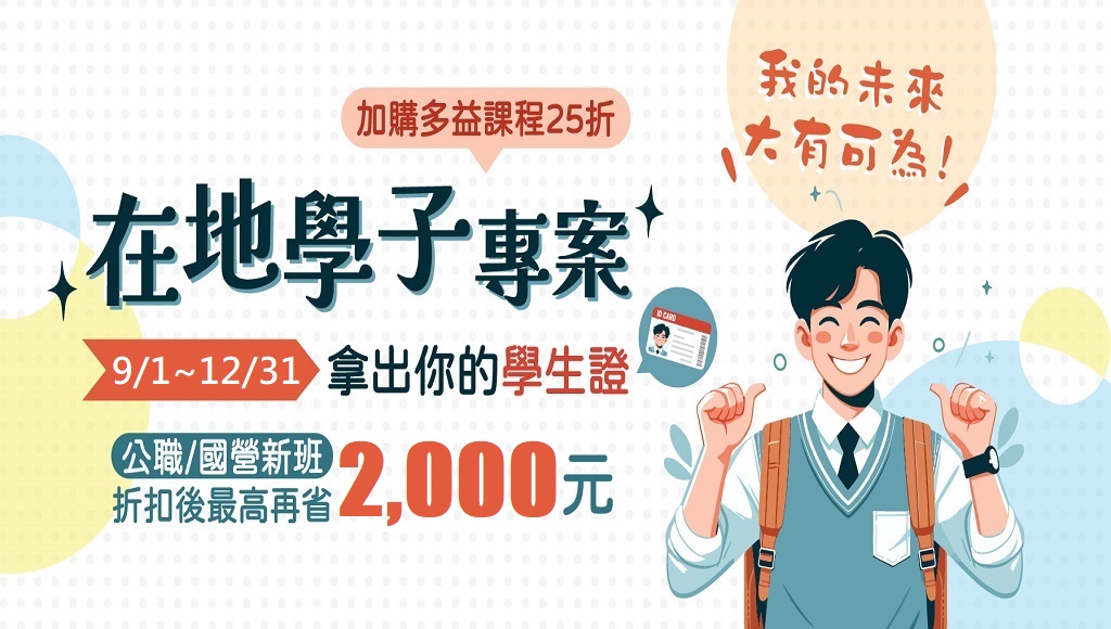 | 3.在校生2人團報折1,000元 2人須當天同時報名正規全套課程,不限定同考試類別 |