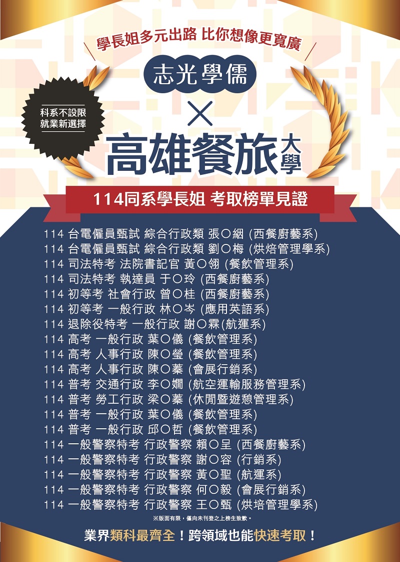 高餐大 x 志光|榜單見證,高餐大 學長姐們 科系不設限 成功上榜
