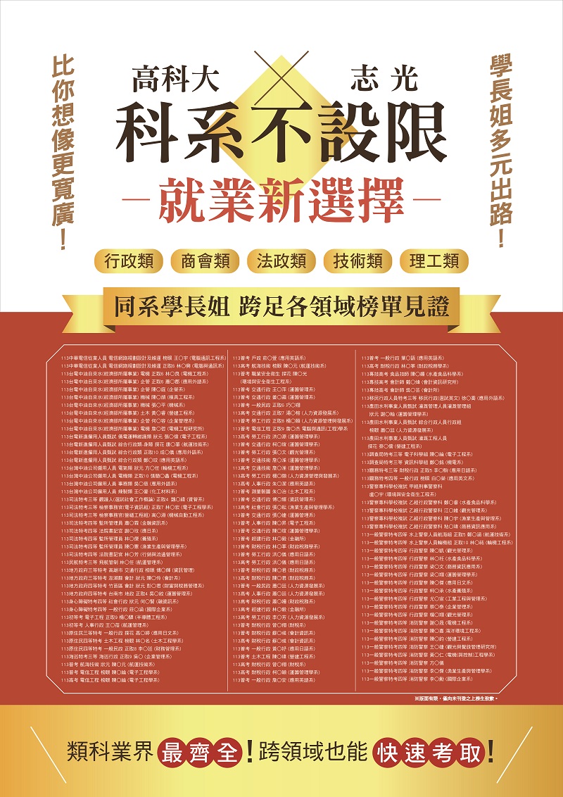 高雄科技大學第一校區大學畢業不迷網,考取國考公職薪資待遇好、福利佳,工作穩定不煩惱。畢業就找到好工作, 規劃針對在校生設計階段性課程,讓你兼顧課業,同時可以準備公職考試,讓你畢業即就業。!高普考、警察、司法特考、國營事業、證照等眾多課程,大學生/應屆畢業生,提早準備,加入49K起薪又穩定的幸福職業生活!志光全國連鎖補習班,提供:上榜生推薦師資、到班專注學習、在家線上學習,隨時切換上課方式、全國72個據點通行。門市獨家限定學生優惠價,課程享最高萬元折扣。