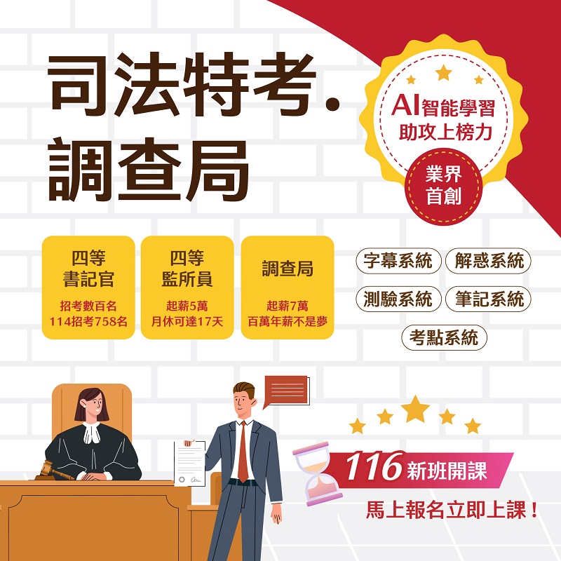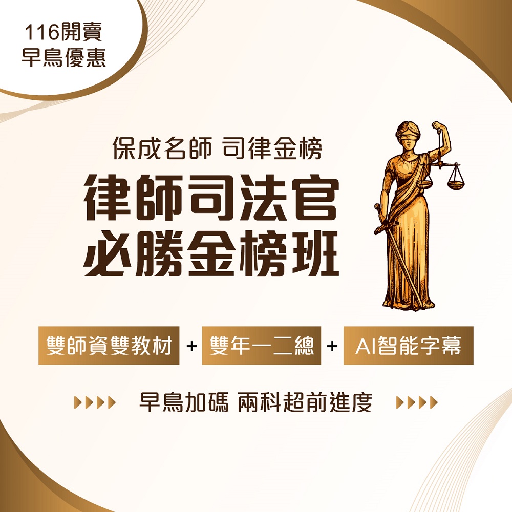 | 不論你是初學者或是想轉換跑道,專屬的法、商、工入門課程都能幫你快速進入學習狀況。 | 專業師資授課,由淺入深帶您掌握考科重點,開課堂數完整,非本科系出身也能跟上進度。 | 統整歷屆試題,掌握出題趨勢並加強練習,有效強化自身解題能力,適合已有基礎的考生。 | 考前關鍵時刻,帶你快速總覽章節重點,補充最新時事,讓你溫故知新,上考場前信心滿滿。 |