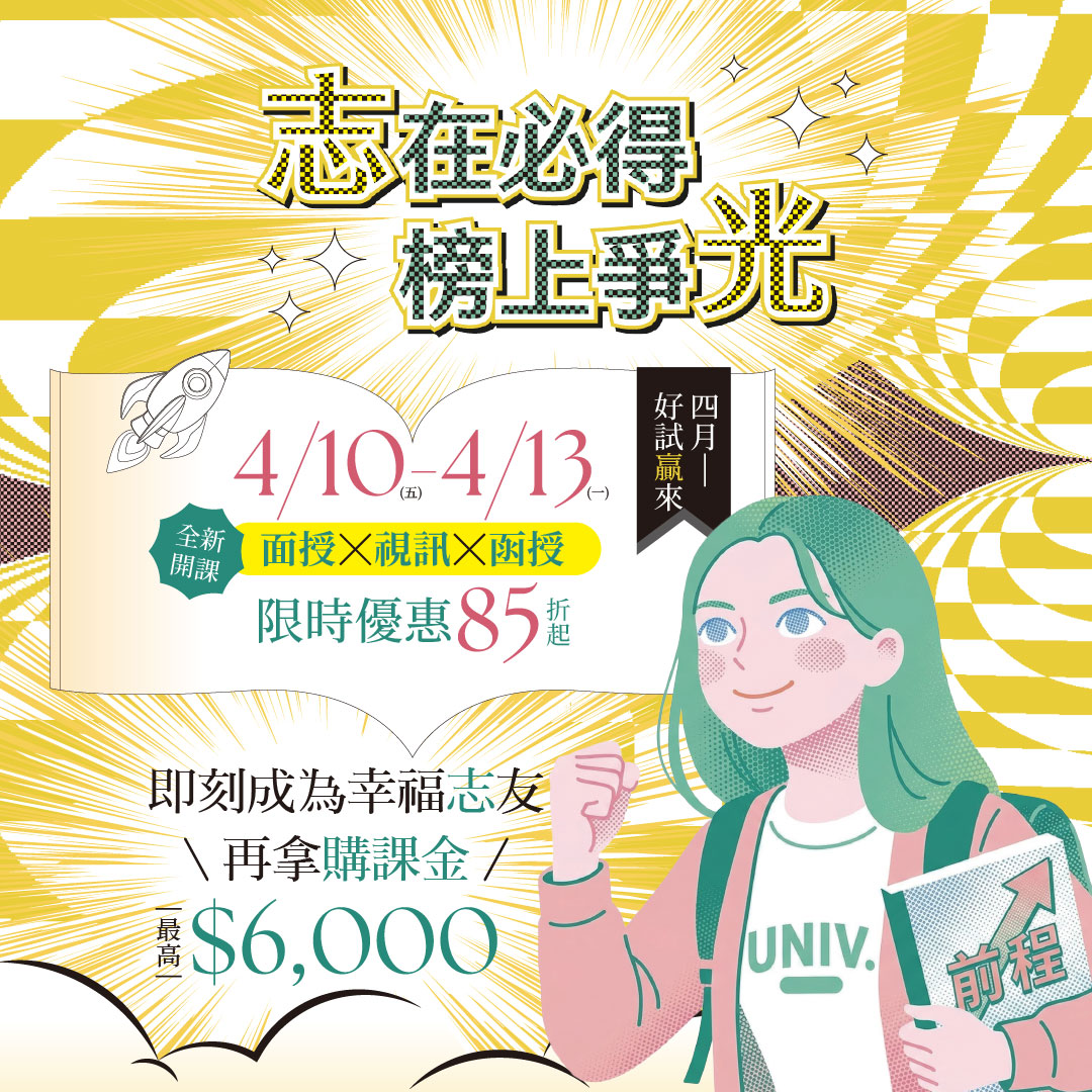 志在必得,榜上爭光 | 4/10-13 課程優惠82折起