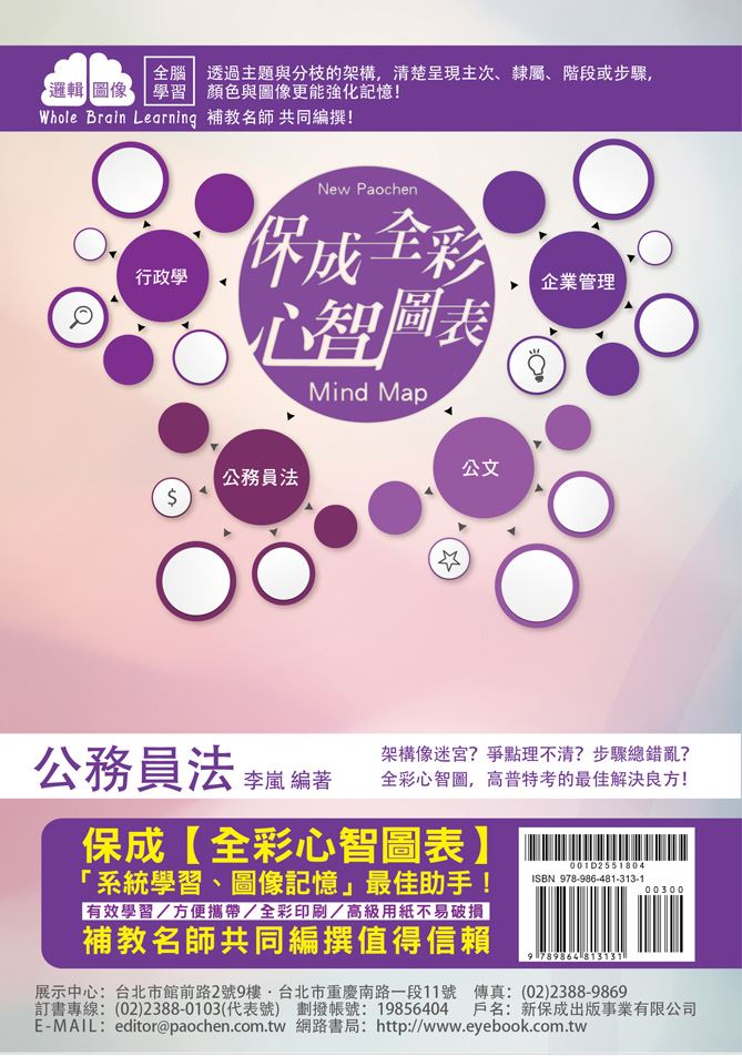 | 熱門推薦:高普考/地方特考-全彩心智圖表系列 ★心智圖像視覺呈現知識點間的關聯性。 ★系統化分類整理,輕鬆建立體系架構。 ★建置自我筆記的最佳幫手,熱烈銷售中。 |