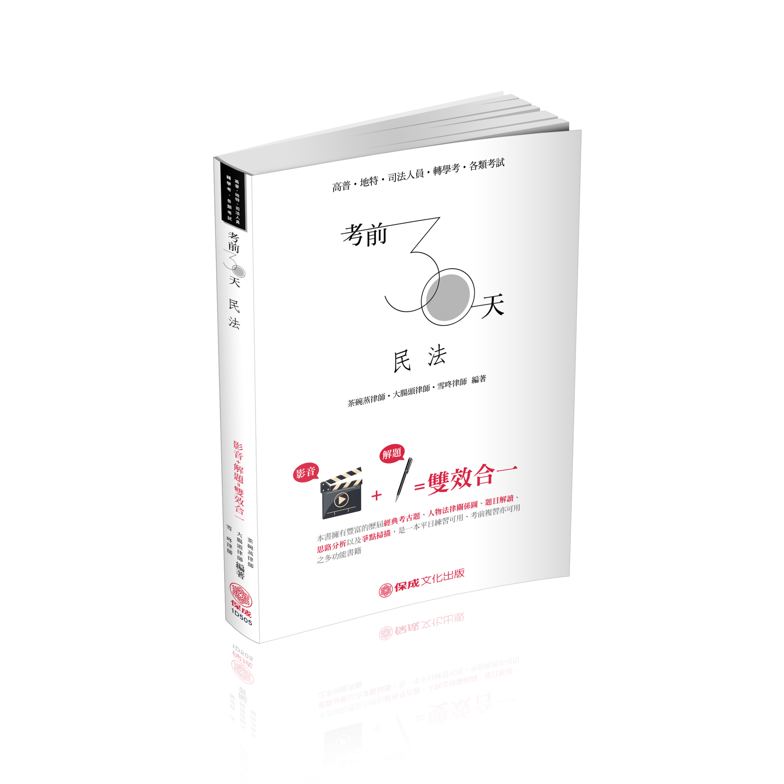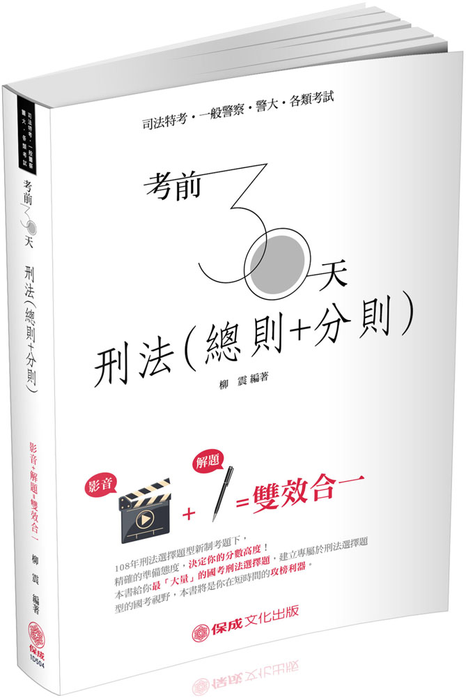 書號:1D505 書名:考前30天-民法-影音+解題 雙效合一 作者:茶碗蒸律師、大腸頭律師、雪咚律師 價錢:400 |