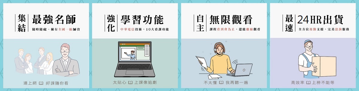 | ♦免出門補習♦ 在家連上網路即可上課 24小時時間彈性 自主學習 ♦重複觀看♦ 課程期限內無限觀看 暫停抄寫筆記、看到會 ♦精美板書♦ 彩色版書 免等抄筆記 精編授課內容 效率學習 |