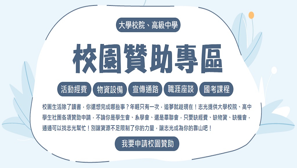 校園生活除了讀書,你還想完成哪些事?年輕只有一次,追夢就趁現在!志光提供大學校院、高中學生社團各項贊助申請,