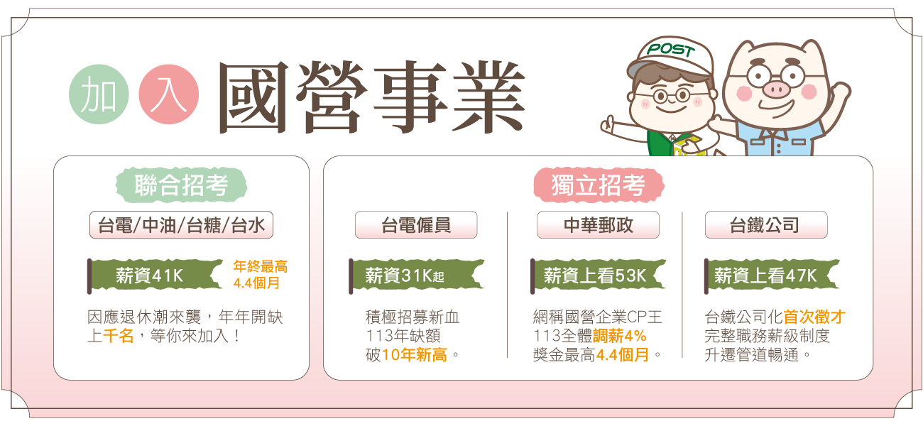 | 不定期招考 | 國營事業聯招 | 1.缺額眾多,類科多元 2.年終最高4.4個月,享各項補助津貼 |