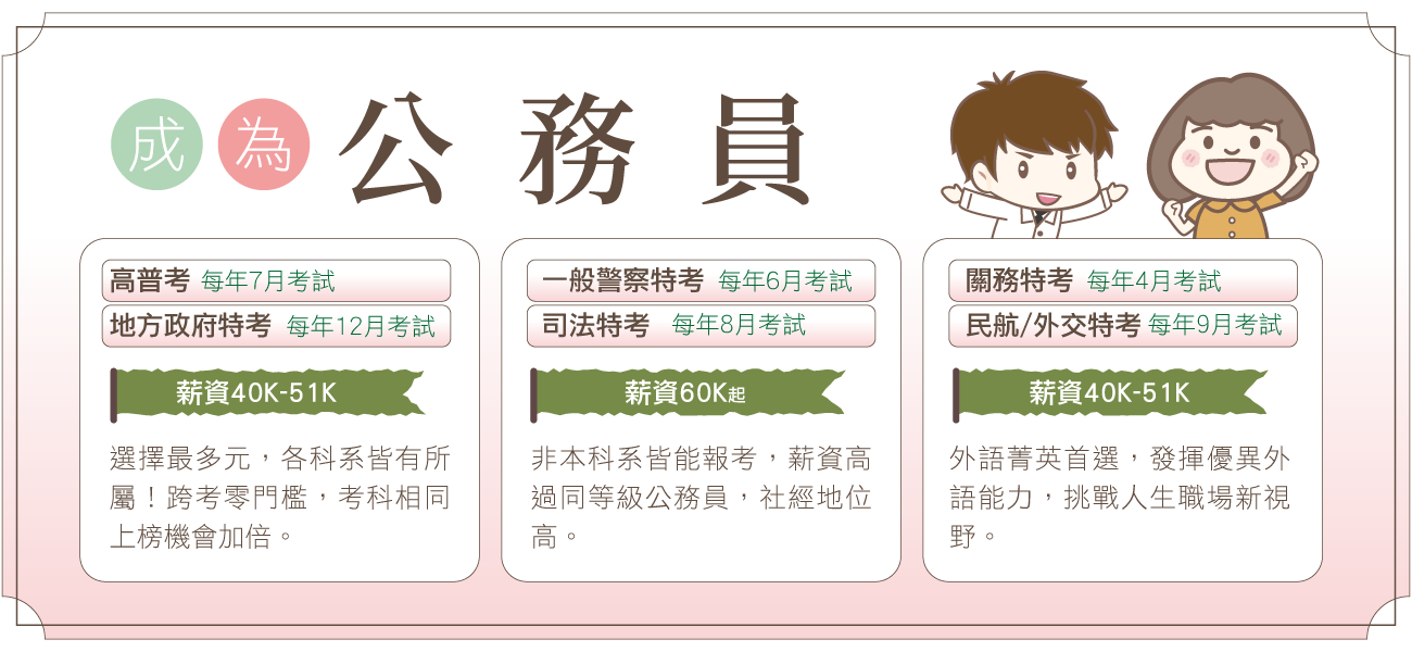 | 7月 | 高普考 | 1.113年度考科調整,大幅減輕備考壓力! 2.缺額最多的國家考試 3.加薪4%,高考起薪突破五萬元 4.類科多元,行政、工科、商科各大學群都能發揮所長 |